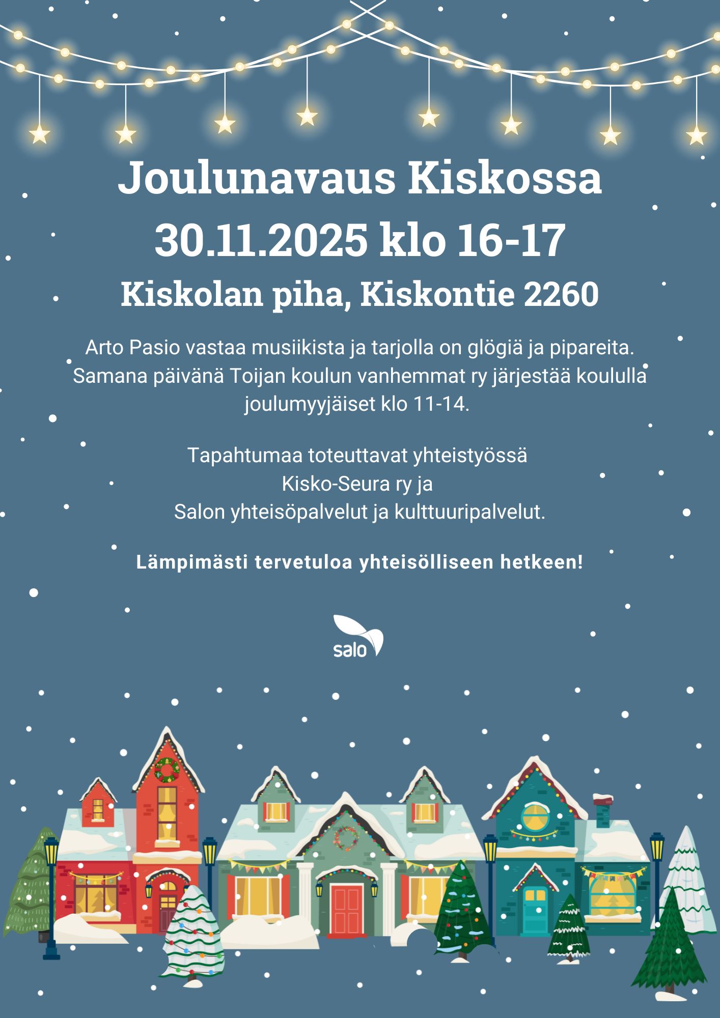 Viime vuonna Kisko sai jouluvalot Kiskolan pihan ulkokuntoilukatokseen. Tänä vuonna jouluvalot syttyvät ensimmäisenä adventtina sunnuntaina 30.11. Samana päivänä on Toijan koululla myös joulumyyjäiset. Joulunavaus Kiskossa sunnuntaina 30.11.2025kello 16-17 Kiskolan pihalla